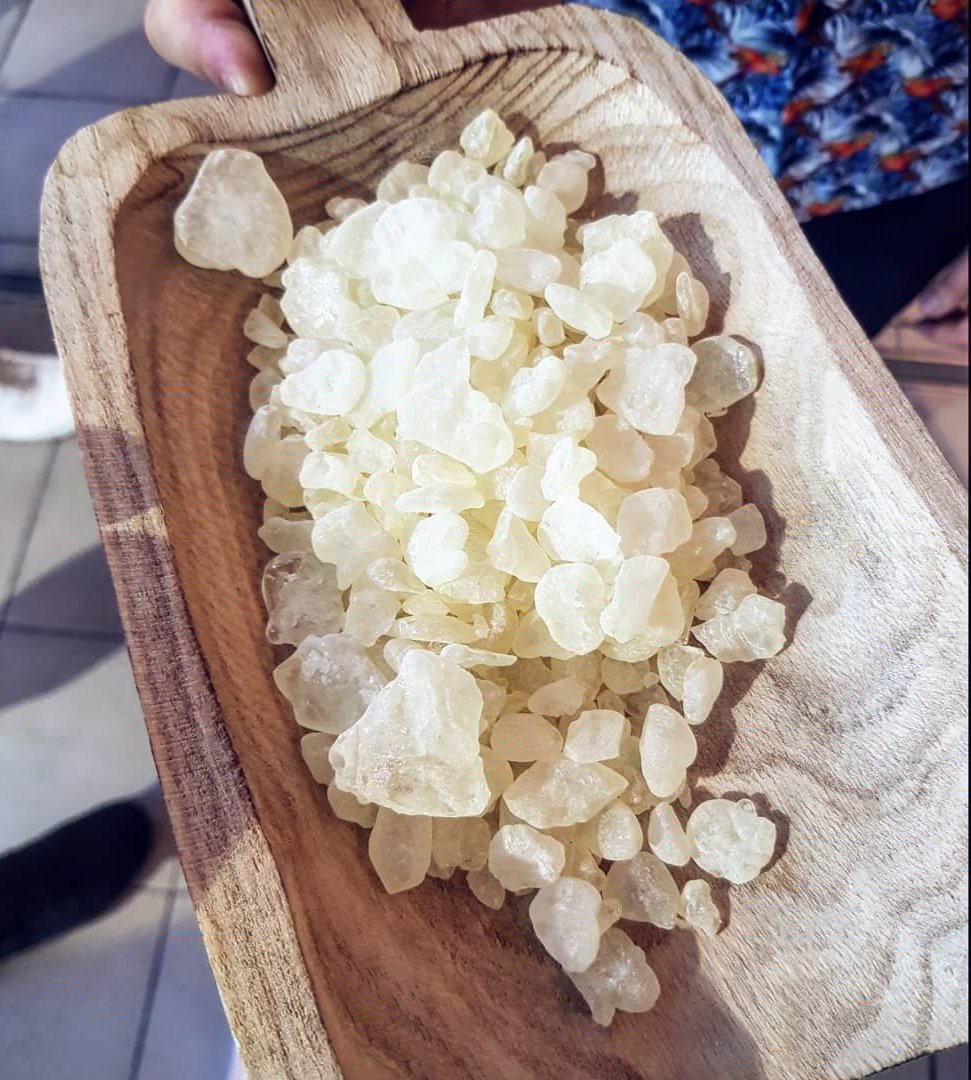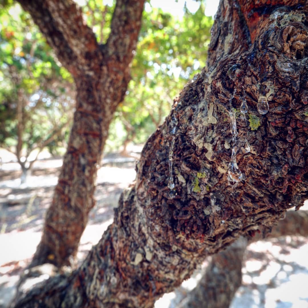 La mastiha è la resina dell’albero del Lentisco, che cresce in tutto il Mediterraneo ma solo a sud dell’isola di Chios viene intagliato e produce una resina che cade al suolo e si solidifica. La raccolta avviene a mano, come da tradizione. Si ottengono dei cristalli di varie dimensioni e forme che vengono puliti ancora oggi dalle signore dei villaggi intorno alle piantagioni.