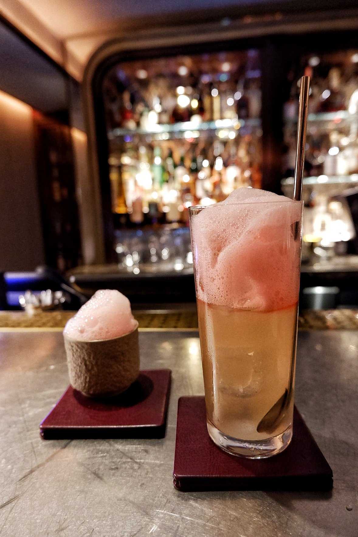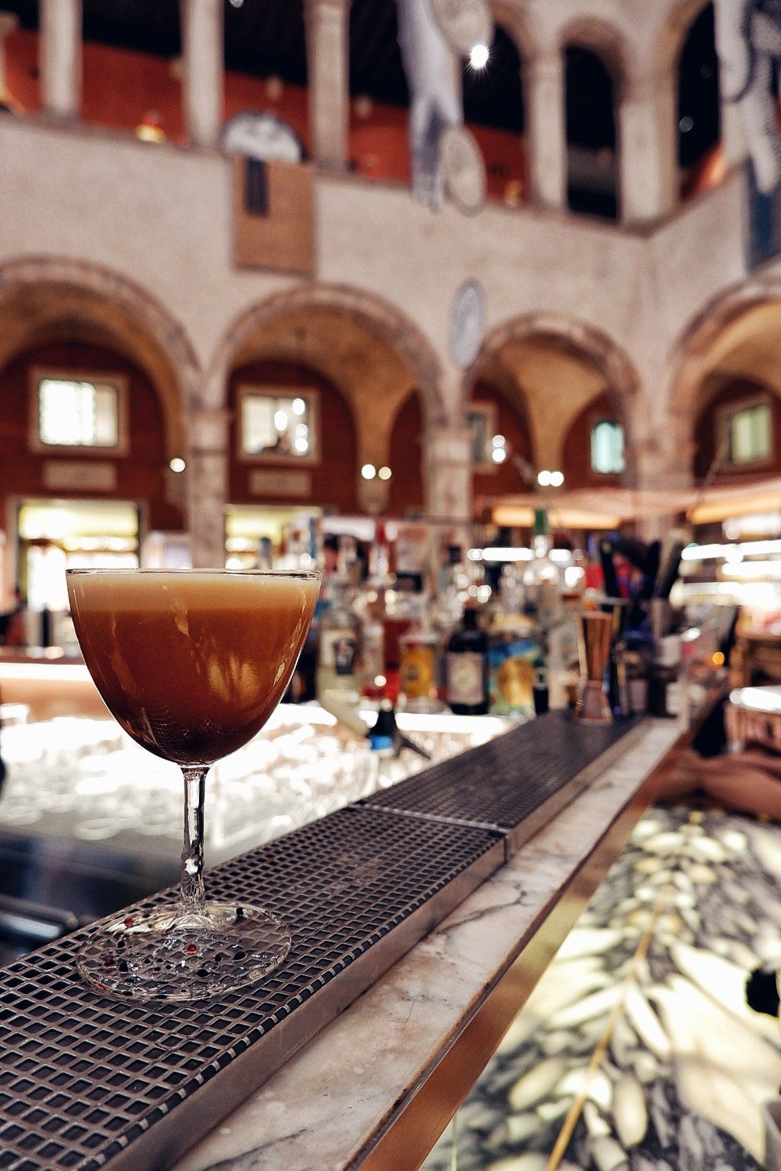 Cominciamo da Amo. All’interno di un complesso commerciale di lusso a due passi dal Rialto, il bar si trova proprio al centro di una sorta di cortile coperto sul quale si affacciano le gallerie. Location molto suggestiva. Amo fa parte del gruppo della famiglia Alajmo, alla guida di una manciata di strutture di eccellenza tra cui uno dei tri-stellati d’Italia, le Calandre. E scusa se è poco. Va da sé che qui ci sia da tenere alto il nome della famiglia anche in quanto a drink. E le aspettative non vengono deluse neanche un po’. Aggiungo che ho un ricordo meraviglioso anche del reparto pasticceria. Quando i bartender sono amici e mi viziano!