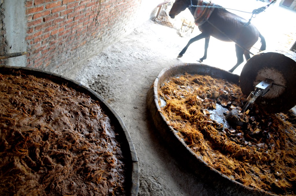 Questo è il processo per spremere le fibre dell’agave cotta e estrarne il succo. Alcuni separano le fibre dal succo delle piñas, altri no.